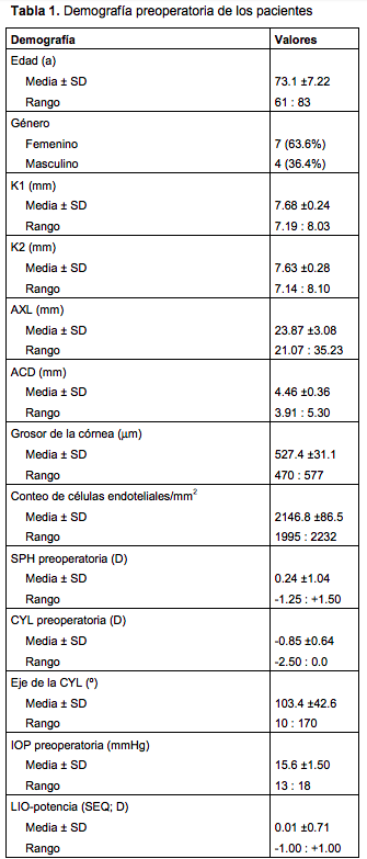 Se reunieron y analizaron los datos pre- y posoperatorios de 18 ojos (11 pacientes). La demografía preoperatoria de la población de estudio se muestra en la Tabla 1.