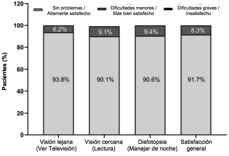 La independencia de las gafas se logró para todas las distancias en todos los ojos en los que se implantó el lente suplementario examinado. La mayoría de los pacientes reportó un alto grado de satisfacción con el resultado de la cirugía en todos los aspectos relacionados con la visión que se examinaron (Figura 9).