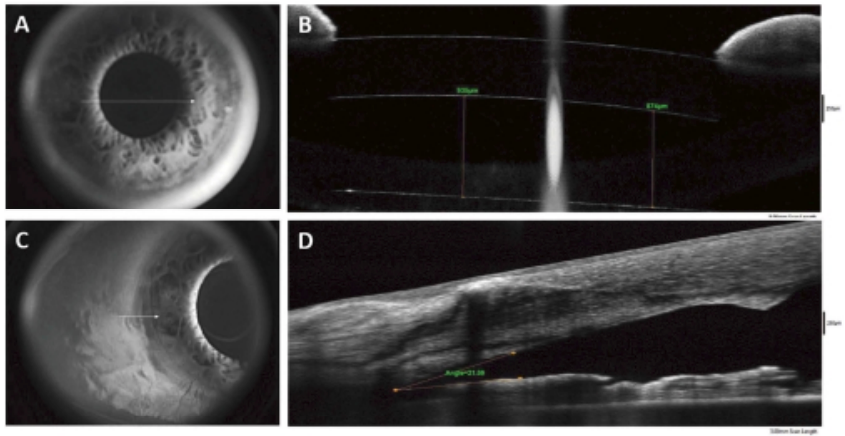 Antes de la cirugía se realizó un detallado examen ocular, incluyendo la topografía de la córnea, aberrometría (iTrace; Tracey Technologies LLC; Houston, TX, EUA), examen del segmento anterior, examen del segmento posterior con una OCT macular (Optovue, Optovue Inc., Fremont, CA, EUA), así como la medición del conteo de células endoteliales (microscopio especular Tomey EM 3000, Tomey GmbH, Tennenlohe, Alemania) y presión intraocular (IOP) (medida con un tonómetro Perkins Mk2, Haag-Streit UK Ltd., Harlow, Reino Unido). También se hicieron las mediciones de la biometría óptica pseudofáquica, incluyendo la longitud axial (AXL), queratometría, grosor de la córnea central y profundidad de la cámara anterior (ACD) (IOL Master 700, Carl Zeiss Meditec AG, Jena, Alemania). Los pacientes con un valor ACD pseudofáquico de menos de 2.8 mm medidos desde el epitelio de la cornea se excluyeron de este estudio.
