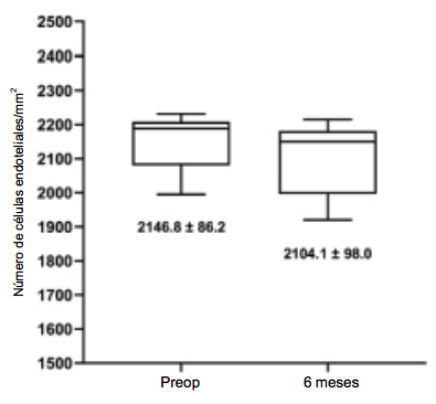 No hubo complicaciones intraoculares o eventos adversos, incluyendo sangrado en la cámara anterior o daño de la córnea o el iris, durante cualquiera de las operaciones. De igual manera, no se reportaron eventos adversos durante el periodo de seguimiento de 6 meses. Se realizaron exámenes completos y detallados para evaluar la posible presencia de inflamación, edema corneal, cierre de ángulo, bloqueo pupilar, captura de iris o síndrome de dispersión pigmentaria. Se encontró que los segmentos anterior y posterior eran normales en todos los casos. También se examinó y registró la posición y apariencia de los LIOs suplementarios y de saco capsular durante la visita posoperatoria a los seis meses. Se encontró que todos los lentes estaban bien colocados sin ninguna inclinación, descentrado, dislocación, decoloración u opacidad. Se pudo medir una distancia de al menos 500 µM entre los dos LIOs de cada ojo incluido en la investigación (Figuras 3A y B). Más aún, se encontró que el ángulo de la córnea estaba en el rango fisiológico en cada ojo (Figuras 3C y D). No hubo reportes de glaucoma secundario o de ángulo estrecho en ninguno de los casos. La densidad de células endoteliales (células/mm2 ) tampoco difirió significativamente de los valores preoperatorios (Figura 4) y sólo se observó una pérdida promedio de 2.00 ±1.58% células (rango: de 0.23% a 5.14%). La presión intraocular tanto pre- como posoperatoria fue similar (p=0.8163; preoperatoria: 15.6 ±1.50 mmHg; rango: de 13 a 18 mmHg; posoperatoria: 15.7 ±1.26 mmHg; rango: de 14 a 17 mmHg) y ninguno de los pacientes tuvo insuficiencia de la película lagrimal durante el periodo posoperatorio.