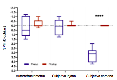 En todos los casos se realizaron mediciones de autorrefractometría y evaluaciones de la agudeza visual lejana, intermedia y cercana. Los resultados pre- y posoperatorios de las mediciones de autorrefractometría de la refracción esférica (SPH, esfera; expresada en dioptrías), junto con la refracción esférica subjetiva para los rangos lejano y cercano se muestran en la Figura 5. Como se puede ver, se logró una mejoría significativa en la visión cercana y, subsecuentemente, una notable reducción de la corrección refractiva necesaria (p<0.0001). Antes del implante del lente suplementario, 16.7% de los ojos tenían una refracción esférica (SPH) de ±0.5 D de la emetropía y 72.2% de los ojos estaban dentro del rango de ±1.0 D.