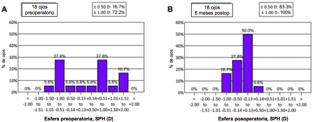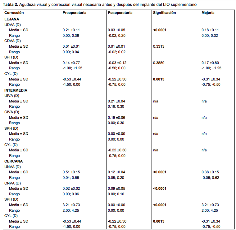 Resultados: En este estudio el 83.3% de los ojos tenían refracciones esféricas dentro del rango de ±0.5 D de la emetropía y 100% de los ojos tenían refracciones equivalentes esféricas que estaban dentro del rango de ±1.0 D de la refracción objetivo. La agudeza visual y las curvas de desenfoque confirmaron claramente su funcionamiento óptico trifocal (UDVA=0.03 ±0.05; UIVA=0.21 ±0.04; UNVA=0.12 ±0.04 logMAR; expresado como media