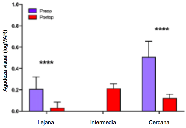 Las mediciones posoperatorias mostraron una mejoría significativa hacia la refracción objetivo, que es la emetropía. La refracción esférica en 83.3% de los ojos estuvo dentro de ±0.5 D de la emetropía, mientras que todos (100%) de los ojos estuvieron dentro de ±1.0 D (Figura 6) del objetivo propuesto. La Figura 7 muestra la agudeza visual pre- y posoperatoria expresada en la escala logMAR, en tanto que la Tabla 2 muestra las correcciones esféricas y cilíndricas necesarias en dioptrías junto con la magnitud promedio de la mejoría en cada caso. Como se puede ver, se observó una mejoría significativa en la agudeza visual lejana y cercana. La agudeza visual intermedia preoperatoria no se midió y sólo se midió en el periodo posoperatorio, en el que los valores mostraron una agudeza visual intermedia funcional.