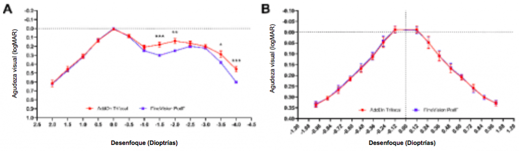 Las curvas de desenfoque monofocal no difirieron entre pacientes que recibieron lentes suplementarios difractivos con potencia lejana cero y pacientes que recibieron lentes con potencias lejanas diferentes de cero (no se muestran los datos). Por lo tanto, las curvas de desenfoque monocular obtenidas en este estudio se presentan como un conjunto de datos combinados para todos los ojos (n=18). Estas curvas de desenfoque confirman el desempeño trifocal de los lentes difractivos implantados en el sulcus con una agudeza visual apropiada en todos los rangos de visión (Figura 8A). Las curvas de desenfoque obtenidas en este estudio con los lentes addon difractivos se compararon con las curvas de desenfoque binocular de pacientes en los que el mismo cirujano implantó previamente el LIO FineVision PodF en el saco capsular siguiendo el mismo protocolo de medición bajo las mismas condiciones. Se usaron pruebas t múltiples para comparar puntos de medición de desenfoque equiparables. La agudeza visual con la adición de -1.5 y -2.0 dioptrías (rango intermedio) fue superior en el grupo trifocal add-on (p=0.0005 y p=0.0019, respectivamente). El LIO add-on suplementario también proporcionó una mejor agudeza visual en el segmento cercano de la curva (p=0.0240 para -3.5 D y p=0.0003 para -4.0 D de adición). Todas las otras secciones de las curvas de desenfoque fueron idénticas entre los grupos con LIO add-on trifocal y con LIO trifocal en saco capsular.