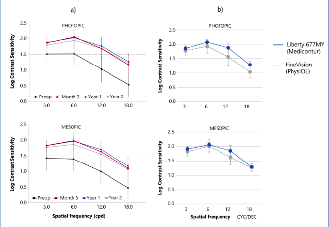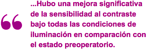 En su estudio con 50 pacientes (100 ojos) que se sometieron a un implante bilateral del LIO trifocal Liberty, el Dr. Győry et al. midió la sensibilidad al contraste a los tres, seis, 12 y 24 meses después de la operación usando una tabla estandarizada (CSV 1000).1