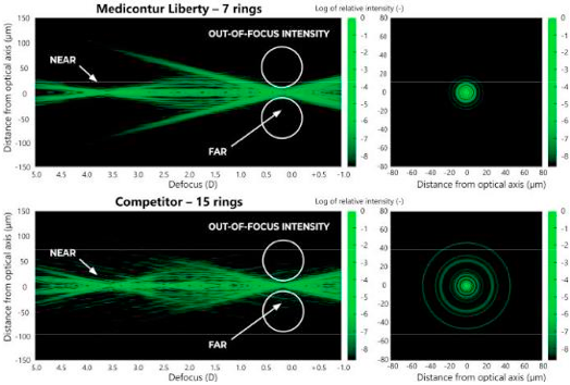“Los investigadores de Medicontur realizaron simulaciones de trazado de rayos para visualizar la intensidad de la luz fuera de foco con diferentes patrones ópticos que representaban diferentes diseños de LIOMs con el fin de evaluar las posibilidades de disfotopsia. Las simulaciones se hicieron mediante una extensión Zemax para el cálculo de la propagación de la luz después de crear la superficie difractiva definida a la medida y se llevaron a cabo con una apertura de 4.5 mm, que corresponde al tamaño promedio de la pupila mesópica para manejar de noche. Los resultados mostraron que la intensidad de la luz fuera de foco a distancias cercana y lejana era menor con el LIO Liberty de siete anillos que con los patrones ópticos que incluían un mayor número de anillos. Al reducir al mínimo la cantidad de luz fuera de foco a la distancia, el diseño difractivo del LIO Liberty también se relacionó con un halo de menor diámetro, que se esperaría fuera menos notorio o molesto para los pacientes” (Fig. 8).