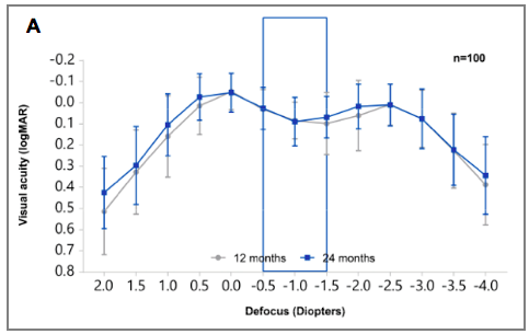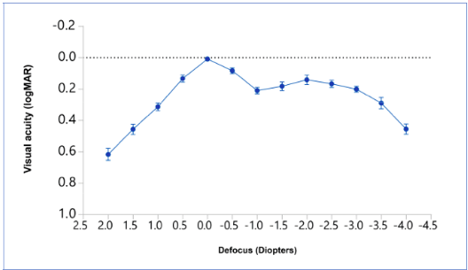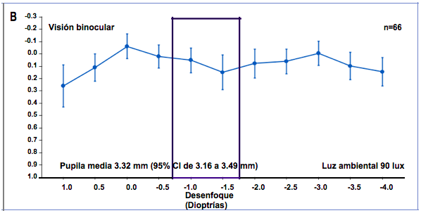 Los datos recopilados a los seis meses9 demostraron la seguridad, predictibilidad y eficacia del procedimiento. La esfera media, cilindro y equivalente esférico fueron -0.32 ± 0.18D, -0.61 ± 0.21D, y -0.015 ±0.09D, respectivamente. La AV logMAR media sin corregir a distancias lejana, intermedia y cercana fue de 0.02 ±0.08, 0.22 ±0.12, y 0.14 ±0.06, respectivamente. Y la curva de desenfoque mostró una AV logMAR media de ≥0.22 en el rango de -3.0 a +0.5D.