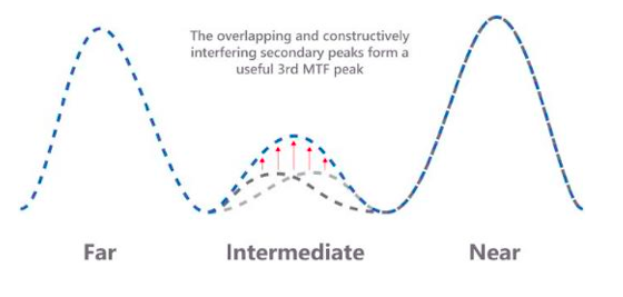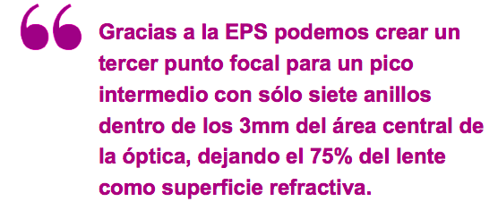 Gracias a la EPS podemos crear un tercer punto focal para un pico intermedio con sólo siete anillos dentro de los 3mm del área central de la óptica, dejando el 75% del lente como superficie refractiva.