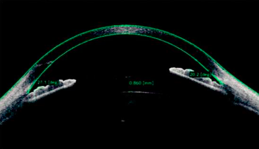 La imagen de la TCO del segmento anterior mostró que la estructura angular permanecía sin cambios y por medio de biomicroscopía se vio que el lente 1stQ AddOn® se mantenía estable en el sulcus. Ninguno de los pacientes requirió una iridectomía o iridotomía periférica, y la PIO no aumentó.