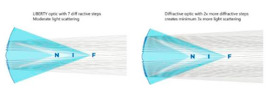 El resultado de este diseño es que, en comparación con una lente bifocal, el LIO Liberty proporciona una visión prácticamente libre de compromisos a distancias cercana y lejana, con el beneficio adicional de una buena visión intermedia. Además, al incorporar la apodización (reduciendo gradualmente la altura de los pasos difractivos del centro a la periferia), el LIO Liberty está diseñado para lograr una distribución óptima de la intensidad de la luz entre los puntos focales lejanos y adicionales, y reducir las pérdidas de luz según el tamaño de la pupila.