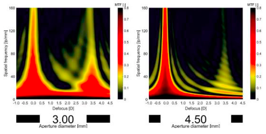 Los resultados de las pruebas de laboratorio demostraron que las intensidades de luz asignadas a diferentes tamaños de apertura proporcionan una excelente visión lejana y cercana, así como suficiente intensidad de luz para la visión intermedia (Fig. 5).