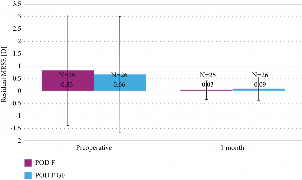 A 1 mes después de la operación ambos grupos de estudio resultaron ligeramente hipermétropes (0.11 ± 0.44 D en el grupo POD F GF y 0.07 ± 0.38 D en el grupo POD F) sin diferencias significativas entre los grupos (p = 0.418). La Figura 2 muestra la distribución del error de predicción: 86% de los ojos en el grupo POD F GF y 80% de los ojos en el grupo POD F estuvieron dentro de ± 0.5 D del MRSE objetivo.