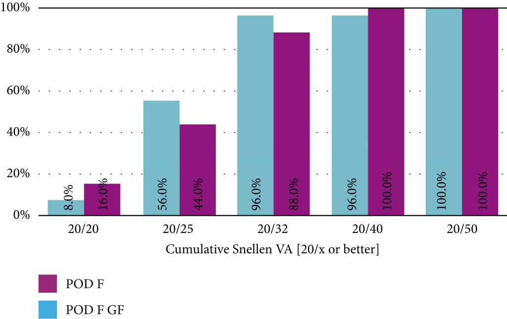 Casi el 85% de los ojos en el grupo POD F GF y 88% de los ojos en el grupo POD F tuvieron una UDVA de 20/25 o mejor y 100% de los ojos en ambos grupos tuvieron una UDVA de 20/50. La CDVA fue de 20/25 o mejor en alrededor del 96% de los ojos en el grupo POD F GF y en todos los ojos (100%) en el grupo POD F. La DCIVA y DCNVA fueron mejores a 20/40 en el 96% y 92% de los ojos en el grupo POD F GF y en todos los ojos (100%) del grupo POD F, respectivamente.