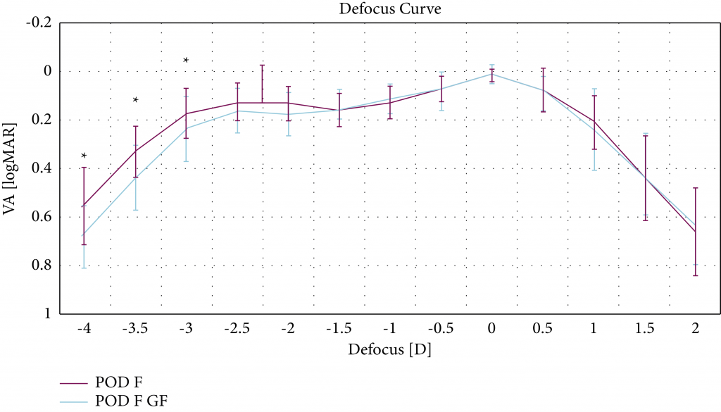 Las curvas de desenfoque en los grupos POD F GF y POD F mostraron dos picos: uno en el nivel de vergencia de 0.0 D (correspondiente a la visión lejana) y uno a −2.5 D (correspondiente a 40 cm). No hubo una disminución considerable en la AV intermedia en el rango de la curva de desenfoque entre −2.5 D y 0.0 D, lo que refleja la clara ventaja que los LIOs trifocales tienen sobre los LIOs bifocales, que se asocian con una