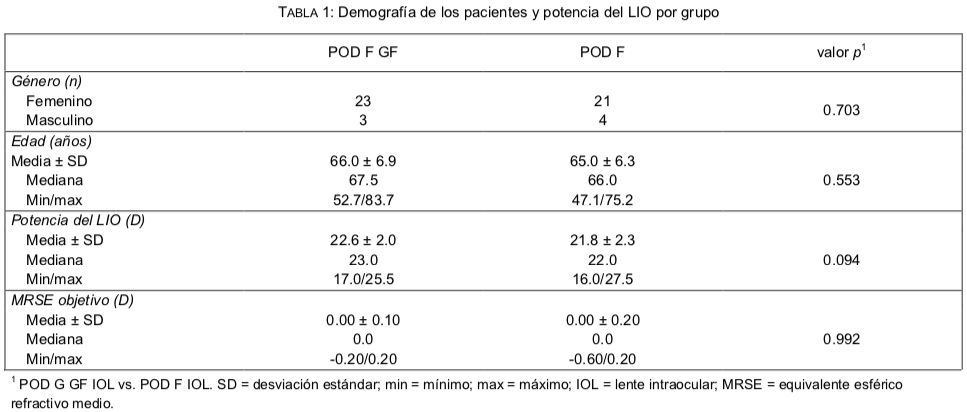 Cincuenta y uno ojos derechos se incluyeron en el análisis del estudio: 26 ojos en el grupo POD F GF y 25 ojos en el grupo POD F. Todos los pacientes tuvieron una cirugía de catarata sin incidentes adversos con el implante del LIO y completaron la fase de seguimiento de 1 mes. Los datos demográficos y la potencia del LIO se resumen en la Tabla 1. No hubo diferencias significativas en la edad, género o potencia del LIO de los pacientes entre los grupos de estudio (p > 0.05).