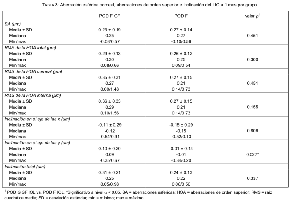 POD F (p = 0.027), mientras que las aberraciones esféricas, HOAs, inclinación en el eje de las x e inclinación total no difirieron entre los grupos.